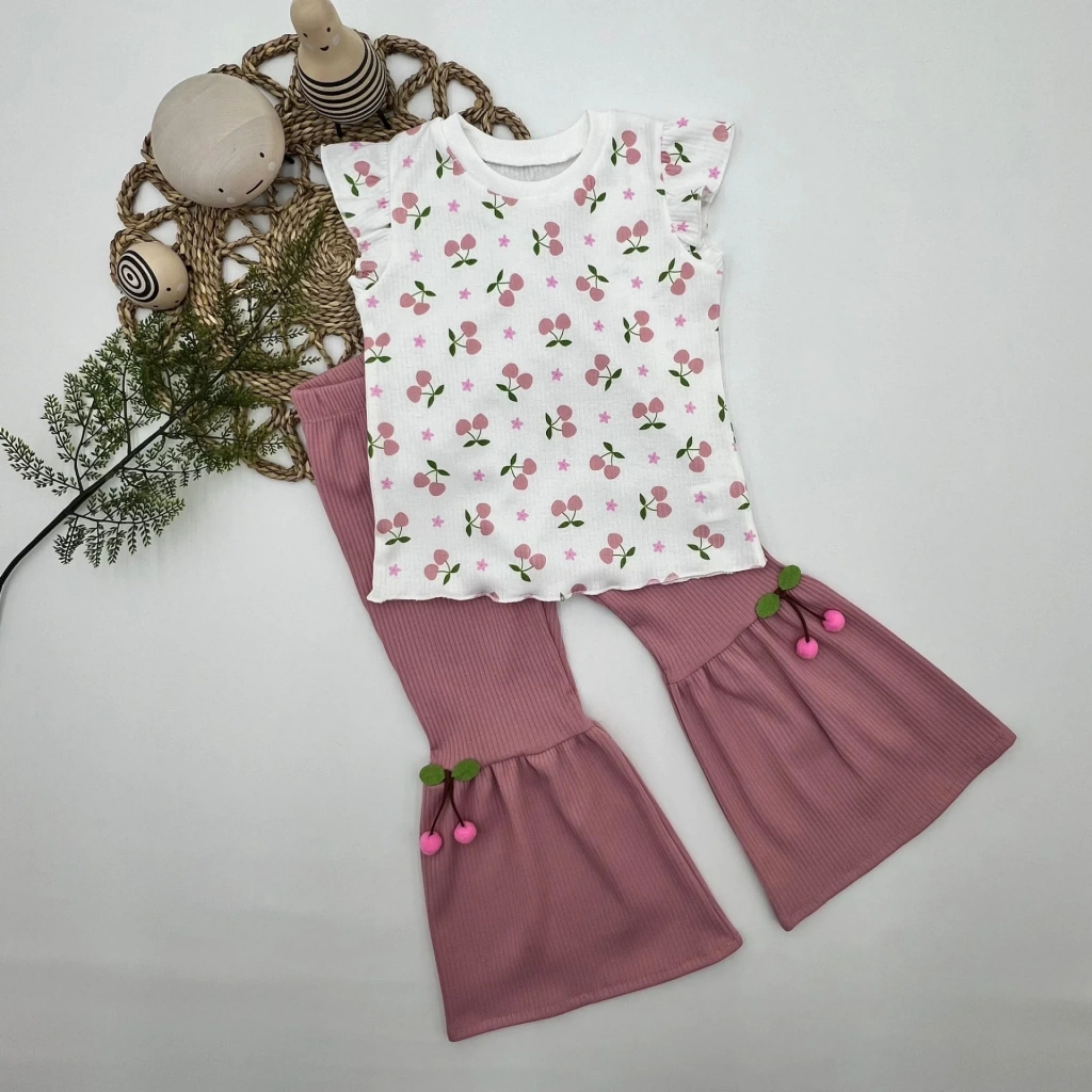 1-2-3-4 Yaş Kiraz Baskılı Tişört İspanyol Paçalı Likralı 2li Kız Çocuk Takımı Gül Kurusu