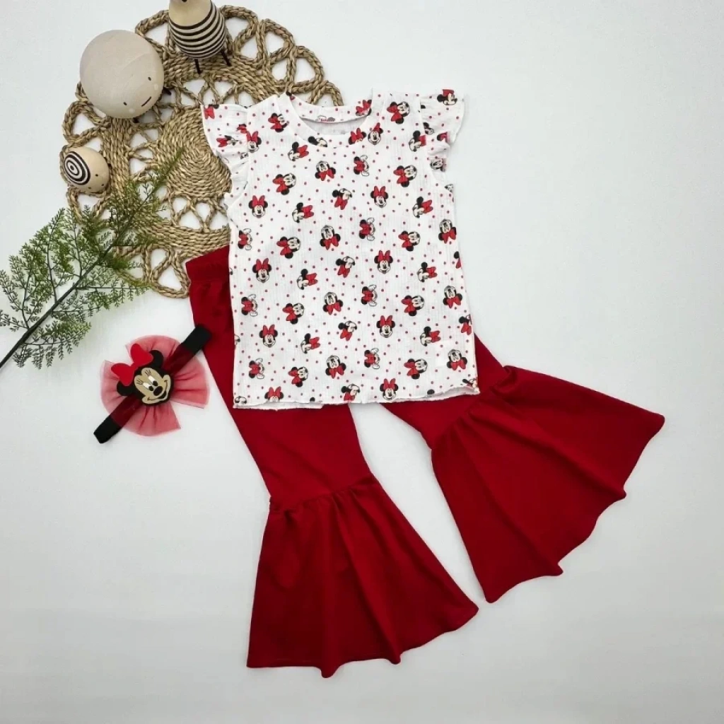 • 1-2-3-4 Yaş Mickey Baskılı Bandanalı Tişört İspanyol Paçalı Likralı 3lü Kız Çocuk Takımı