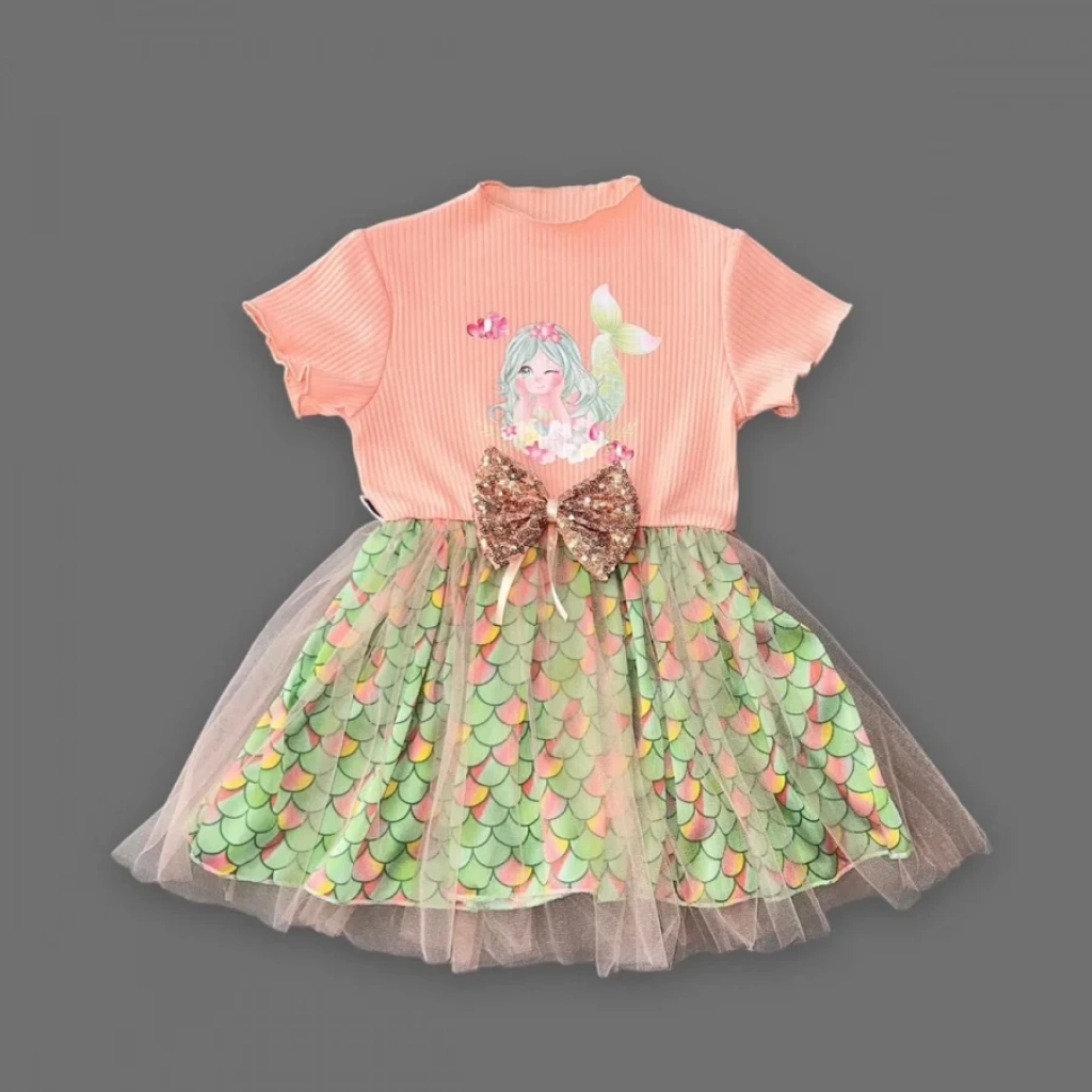 • 1-2-3 Yaş Denizkızı Baskılı Pul Desen Etekli Kız Bebek Elbisesi