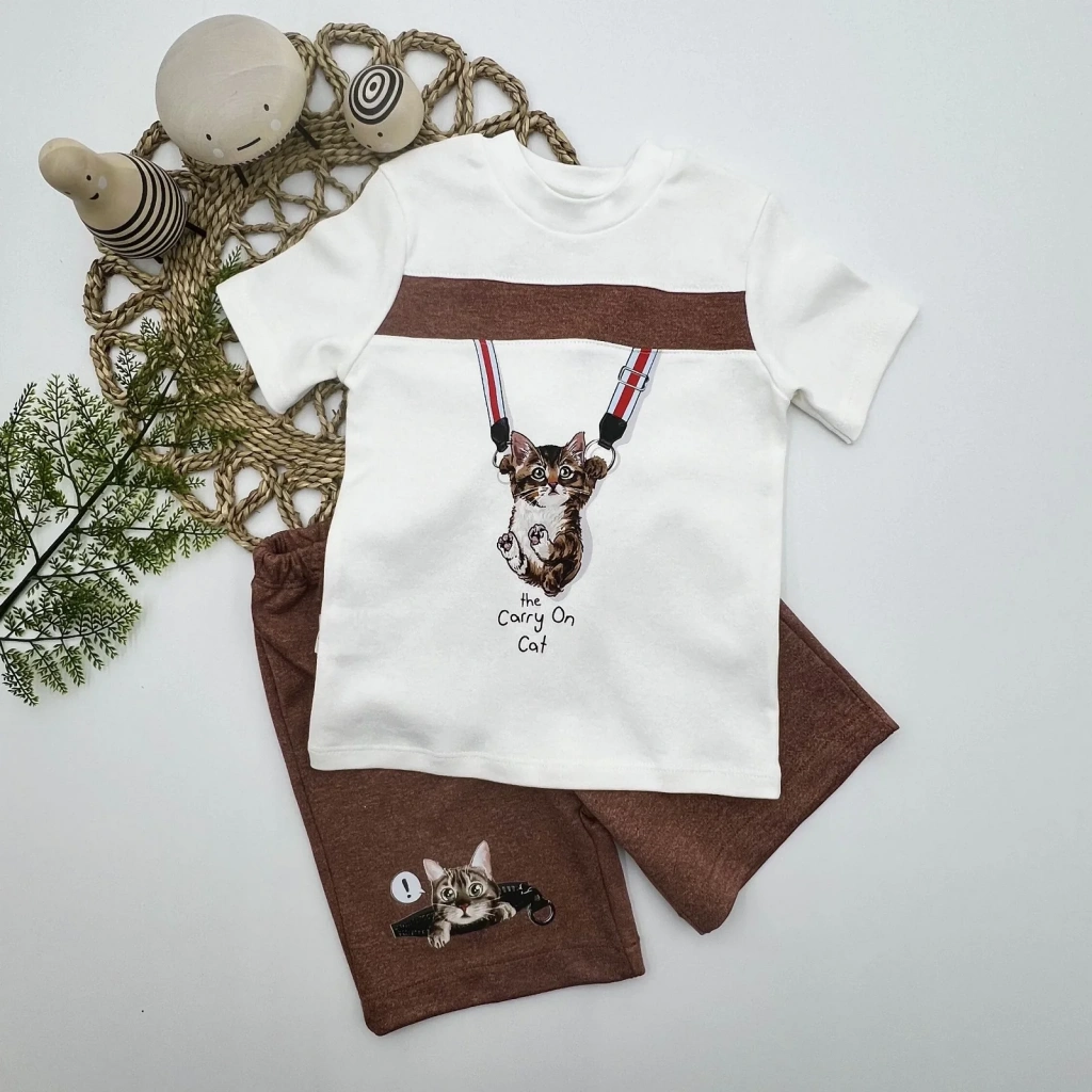 1-2-3 Yaş Fermuarlı Kedi Baskılı Şortlu Kısa Kollu Tişört 2li Erkek Bebek Takımı Kahverengi