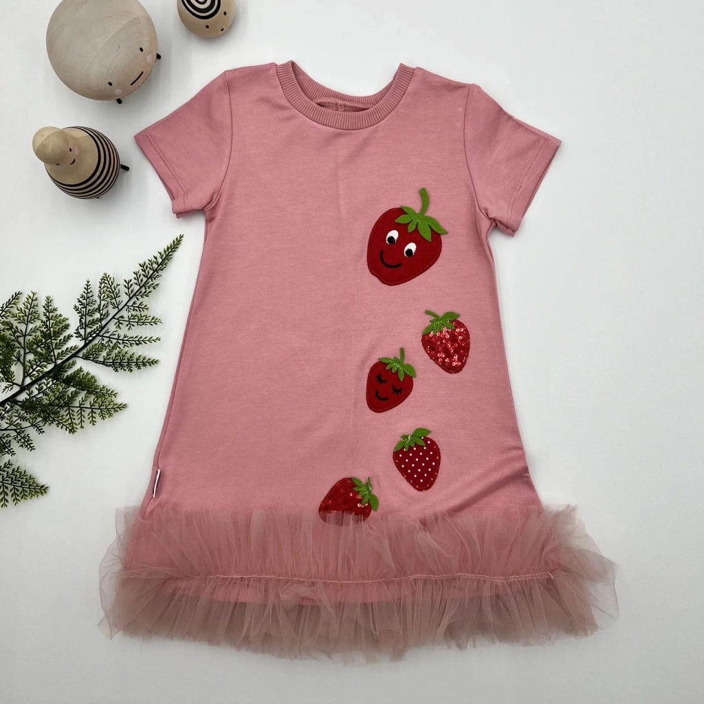 1-2-3 Yaş Payetli Çilekler Nakışlı Eteği Fırfırlı Jile Kız Çocuk Elbisesi Gül Kurusu