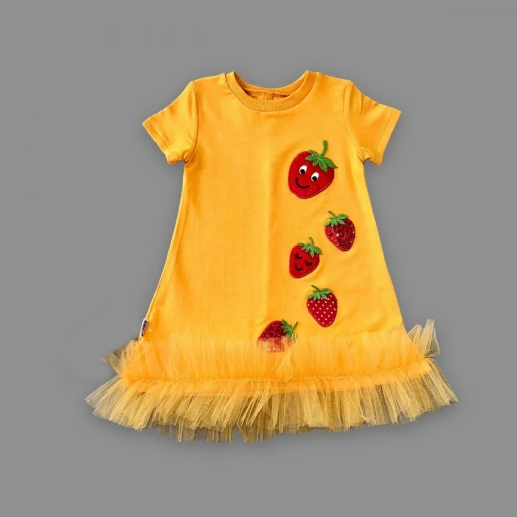 • 1-2-3 Yaş Payetli Çilekler Nakışlı Eteği Fırfırlı Jile Kız Çocuk Elbisesi