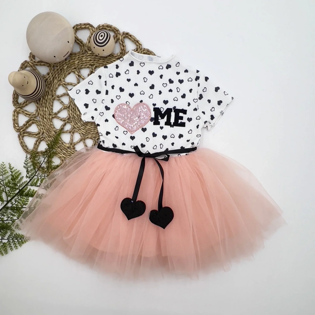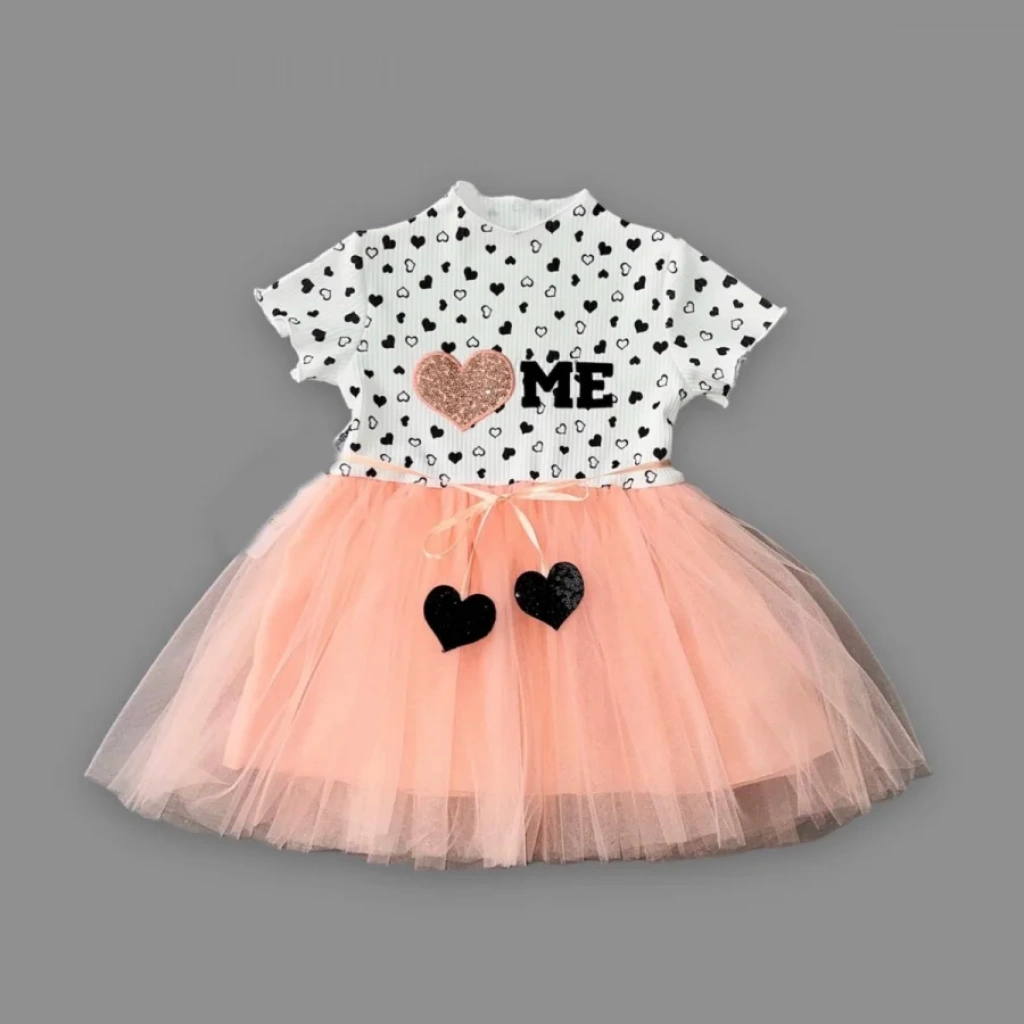 • 1-2-3 Yaş Payetli Kalp Me Baskılı Kız Bebek Elbisesi