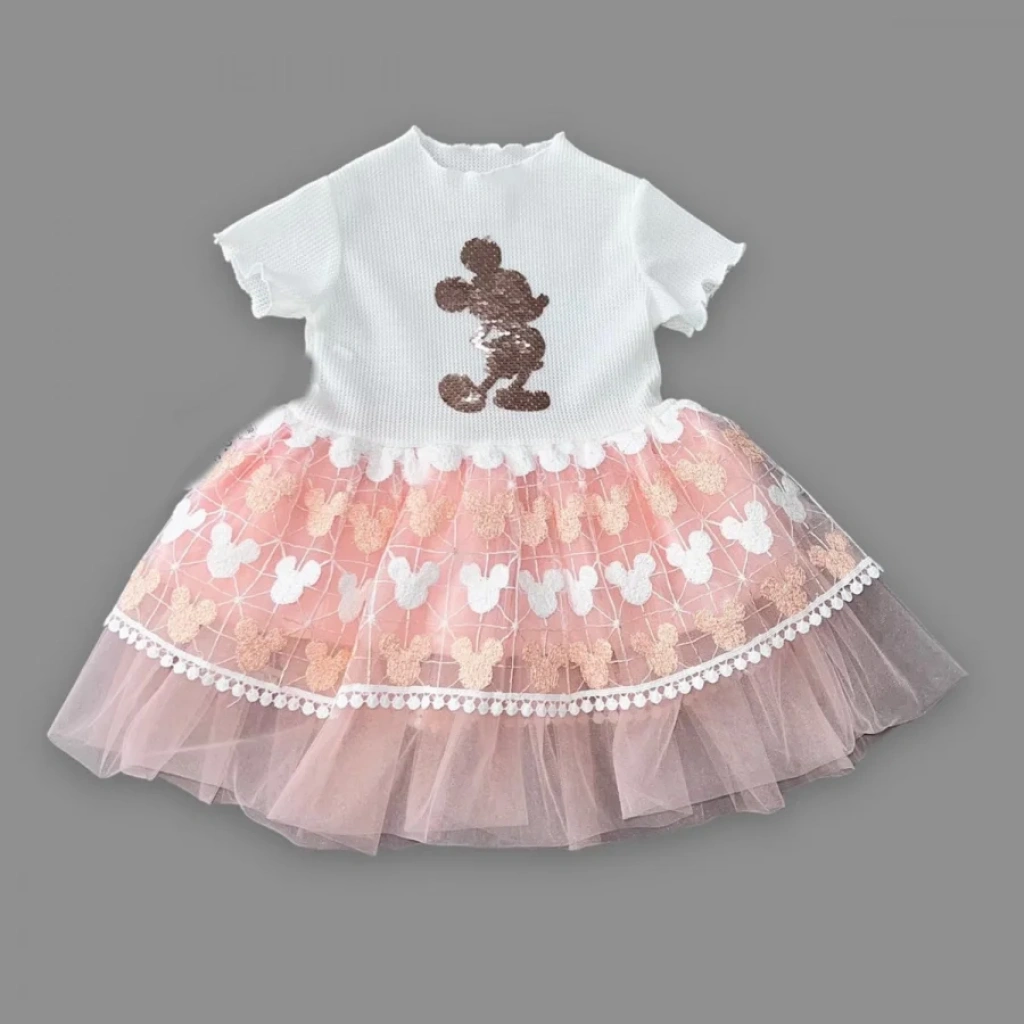 1-2-3 Yaş Payetli Mickey Baskılı Brode Etekli Kız Bebek Elbisesi Pudra