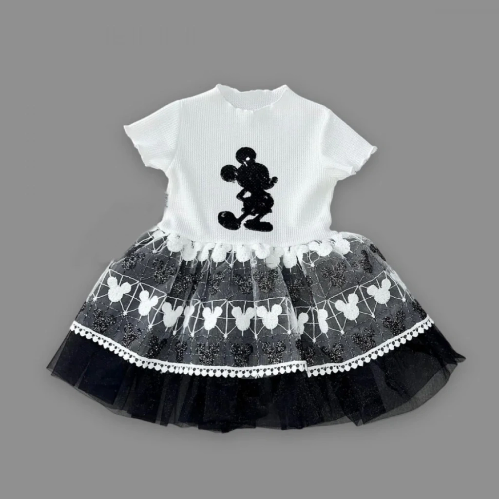 • 1-2-3 Yaş Payetli Mickey Baskılı Brode Etekli Kız Bebek Elbisesi