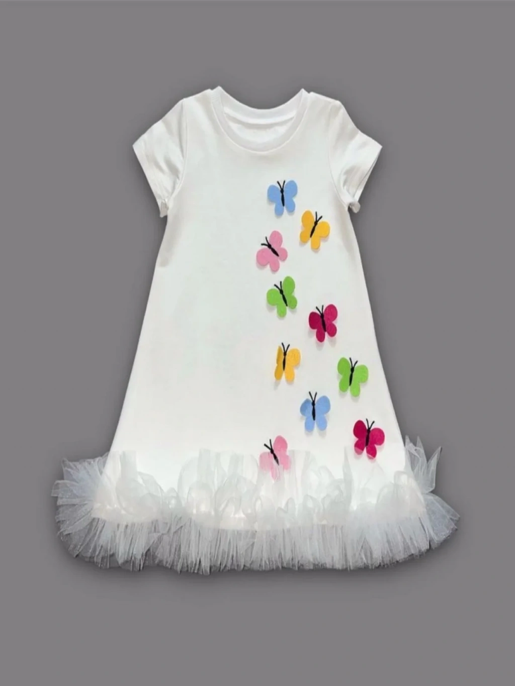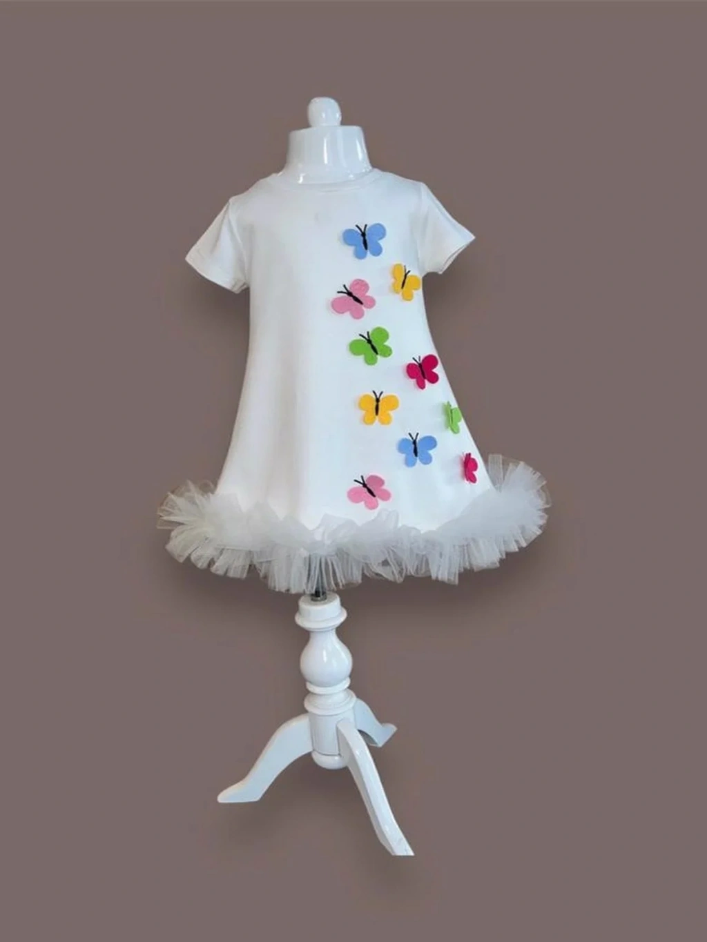 1-2-3 Yaş Renkli Kelebekler Nakışlı Eteği Fırfırlı Jile Çocuk Elbisesi Beyaz