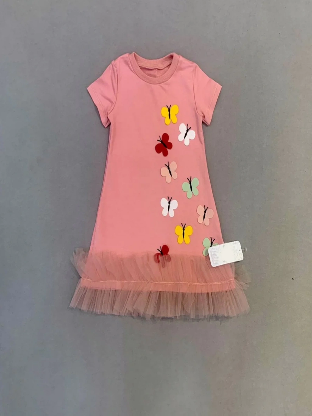 1-2-3 Yaş Renkli Kelebekler Nakışlı Eteği Fırfırlı Jile Çocuk Elbisesi Gül Kurusu