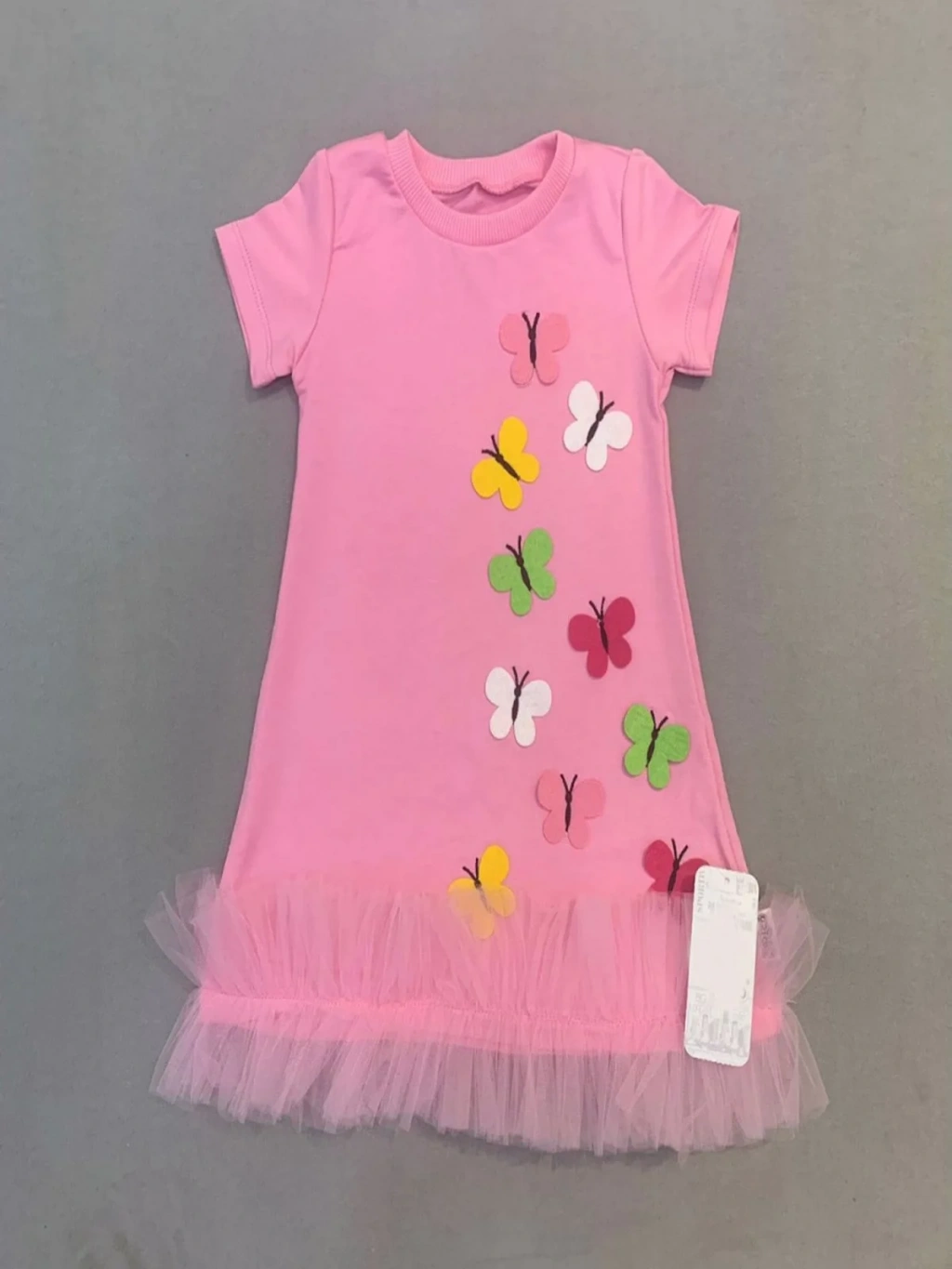 1-2-3 Yaş Renkli Kelebekler Nakışlı Eteği Fırfırlı Jile Çocuk Elbisesi Pembe