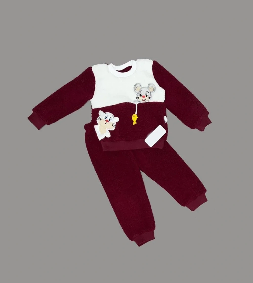1-2-3 Yaş Sallanan Balık Nakışlı Kuzu Kumaş Sweat Pantolon Uzun Kollu Kız Erkek 2 Li Takımı Bordo