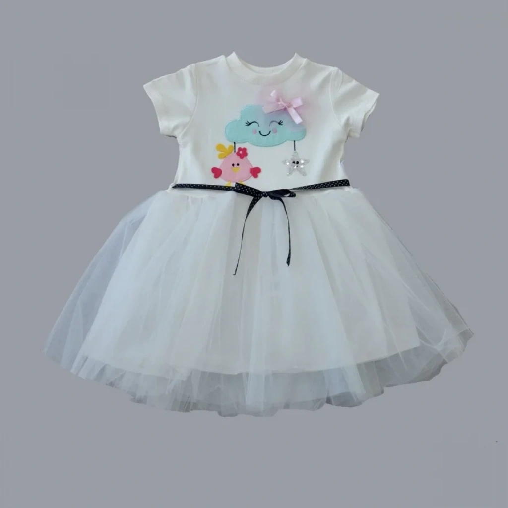 • 1-2-3 Yaş Tül Tokalı Bulut Civciv Ve Yıldız Nakışlı Kız Bebek Elbisesi