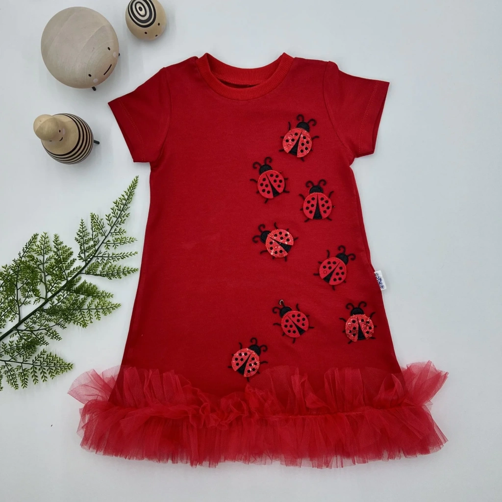 • 1-2-3 Yaş Uğur Böceği Nakışlı Fırfır Uçlu Kız Çocuk Jile Elbisesi