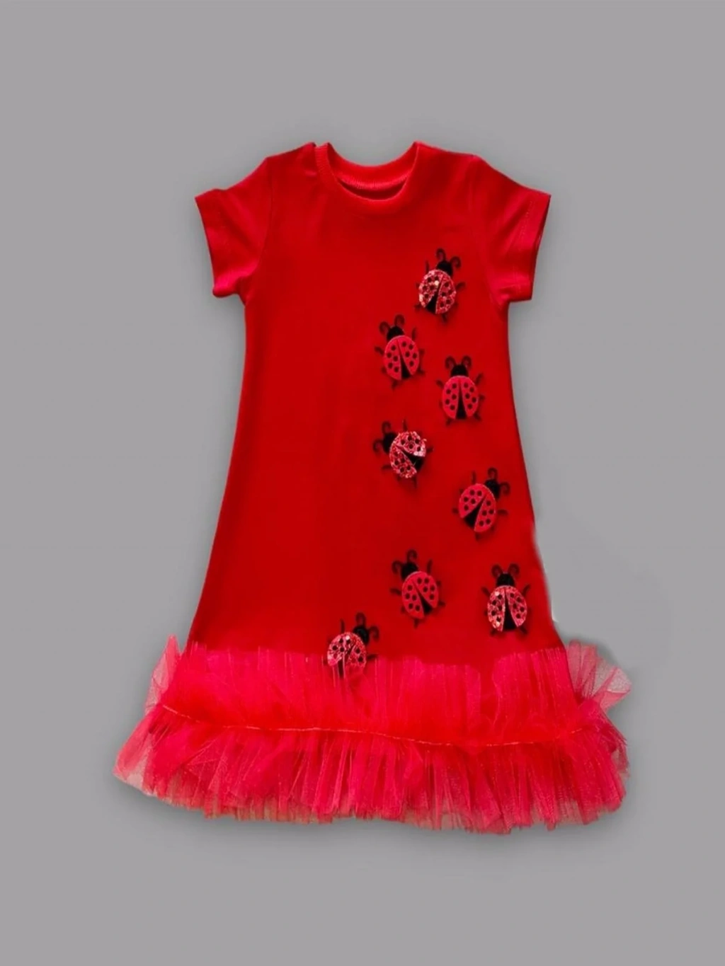 1-2-3 Yaş Uğur Böceği Nakışlı Fırfır Uçlu Kız Çocuk Jile Elbisesi Kırmızı