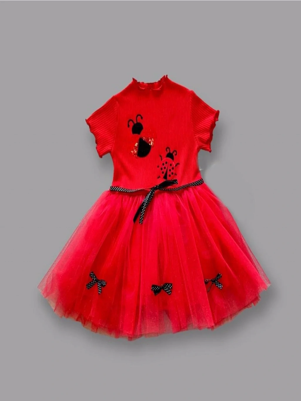 1-2-3 Yaş Uğur Böceği Nakışlı Kurdela Kuşak Kız Çocuk Elbisesi Kırmızı