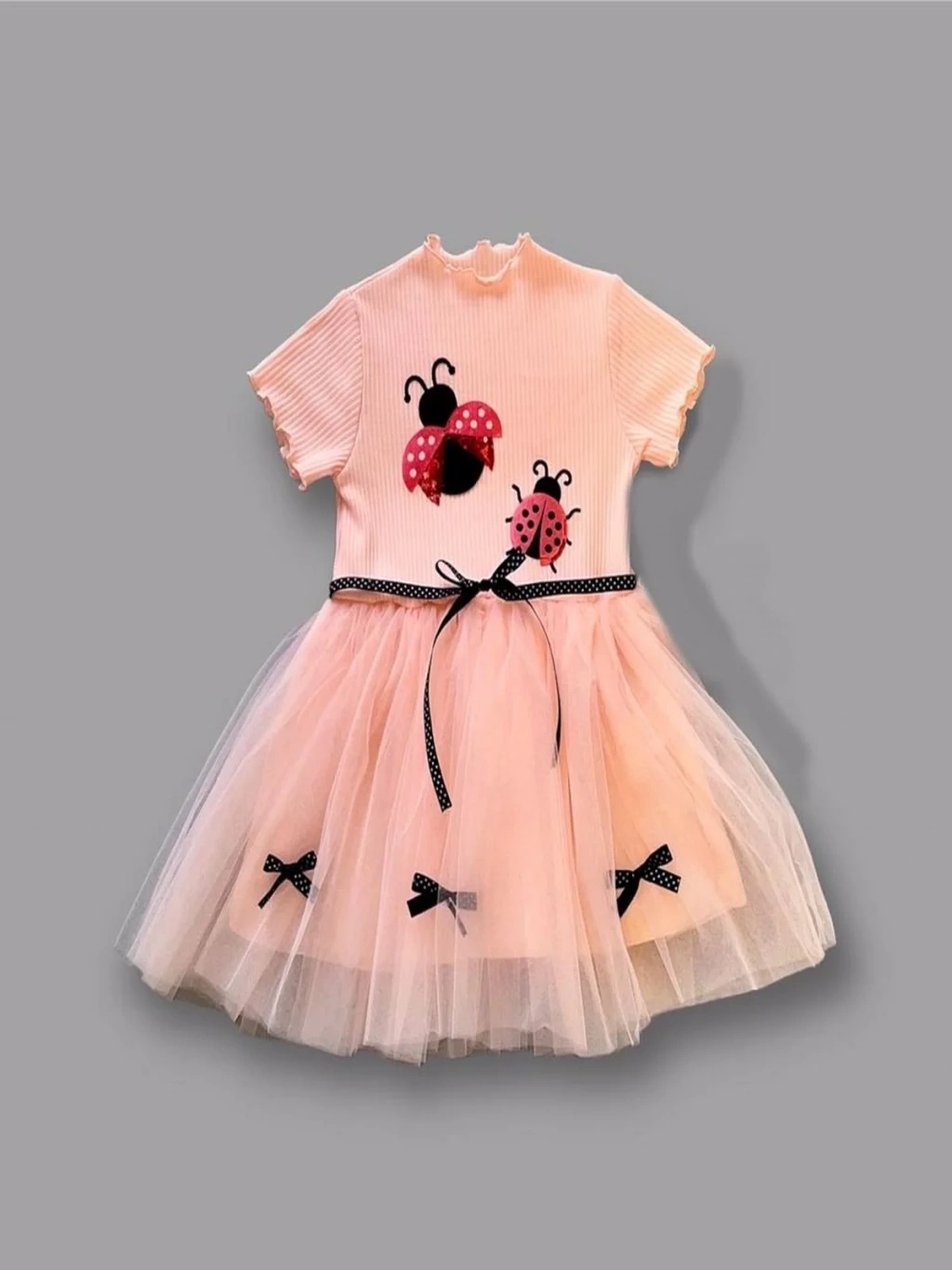 1-2-3 Yaş Uğur Böceği Nakışlı Kurdela Kuşak Kız Çocuk Elbisesi Somon