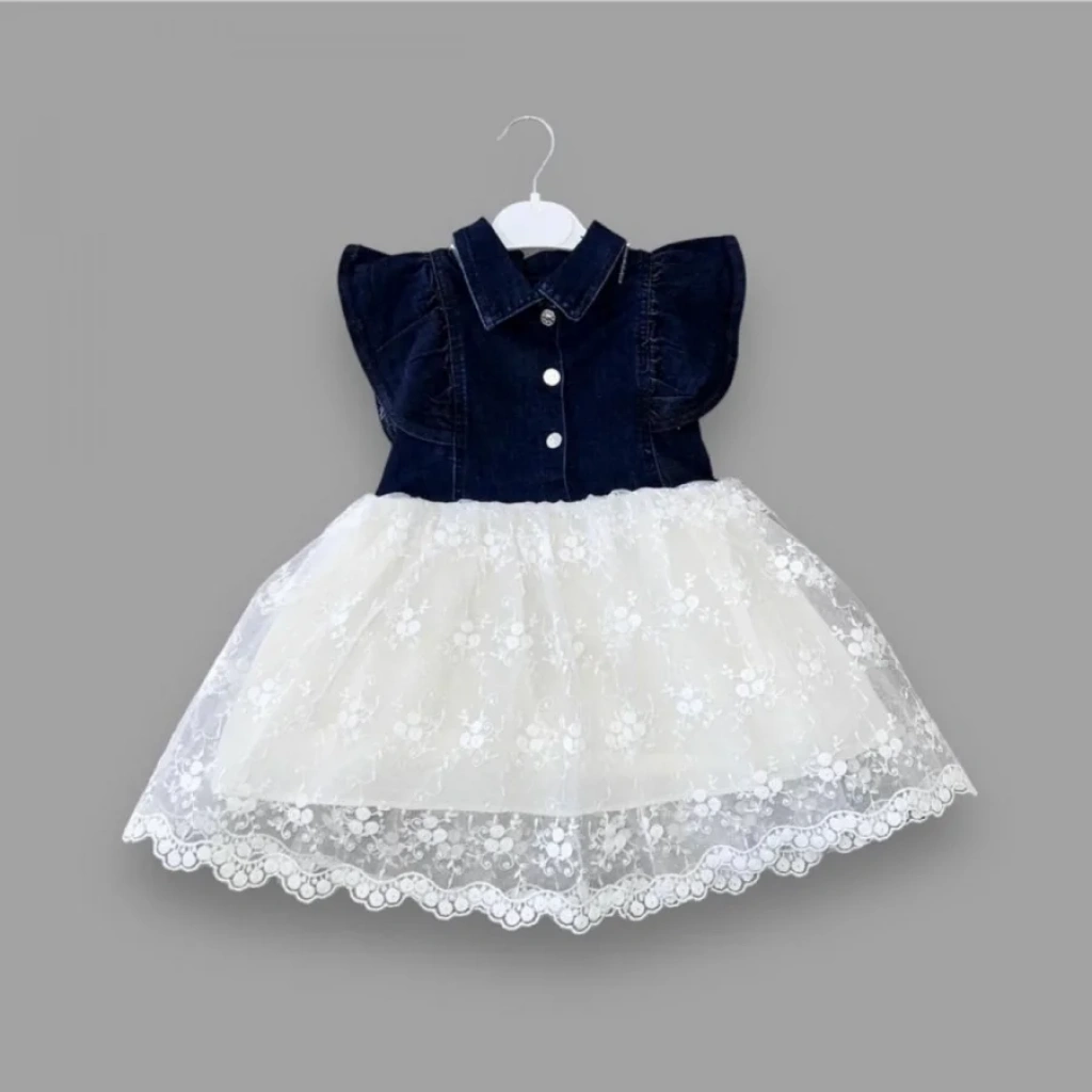2-3-4 Yaş Astarlı Brode Etekli Kot Kumaş Düğmeli Kız Çocuk Elbisesi Lacivert