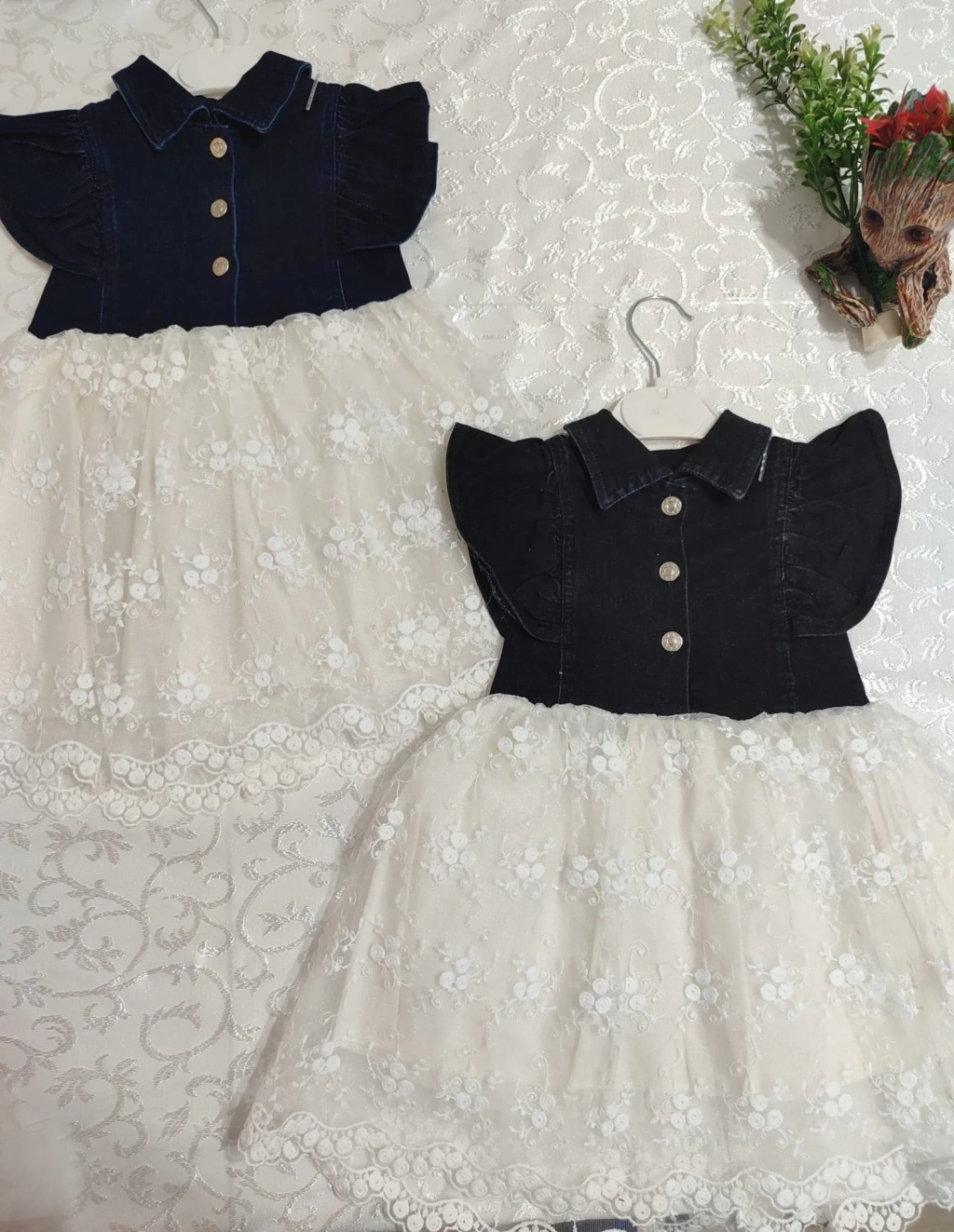 • 2-3-4 Yaş Astarlı Brode Etekli Kot Kumaş Düğmeli Kız Çocuk Elbisesi