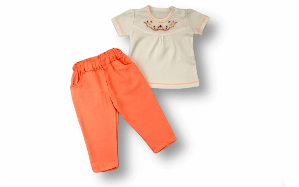 3-6 6-9 9-12 12-18 Ay Anadolu Çiçeği Nakışlı Kısa Kollu Sweatli 2li Kız Bebek Takımı Turuncu