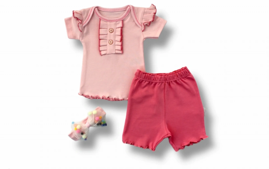• 3-6 6-9 9-12 12-18 Ay Düğme Detaylı Bandanalı Kısa Kollu Sweat 3lü Kız Bebek Takımı