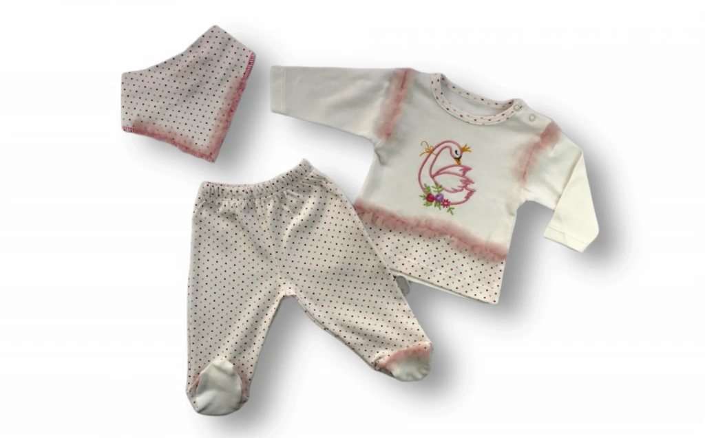 • 3-6 6-9 9-12 Ay Kraliçe Kuğu Nakışlı Bandajlı Uzun Kollu Sweatli 3lü Kız Bebek Takımı
