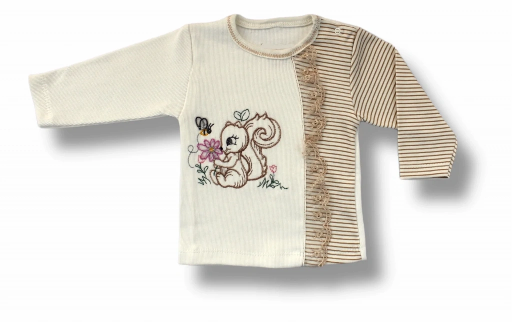 3-6 6-9 9-12 Ay Minik Sincap Nakışlı Şapkalı Uzun Kollu Sweatli 3lü Kız Bebek Takımı Kahverengi