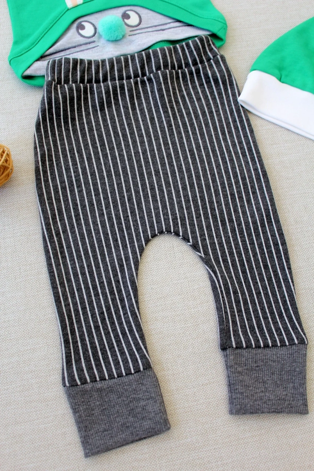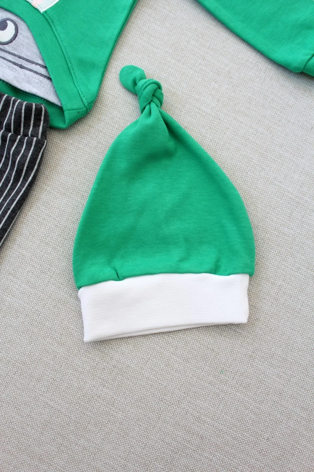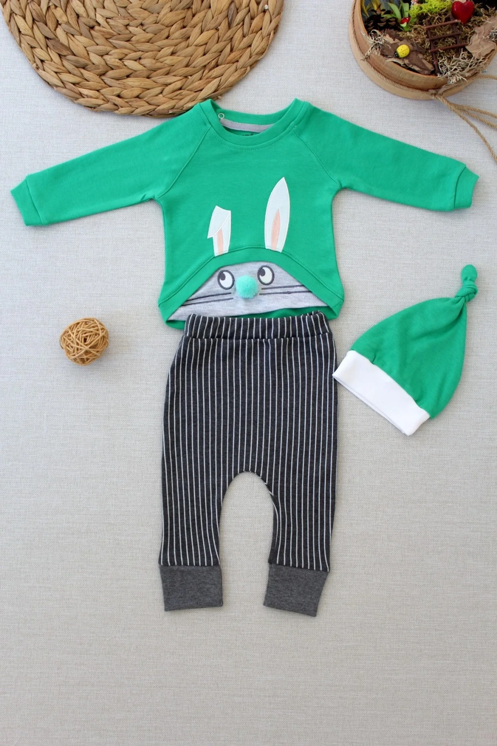 3-6 6-9 9-12 Ay Şımarık Tavşan Nakışlı Şapkalı Uzun Kollu Sweat 3lü Kız-erkek Bebek Takımı Yeşil
