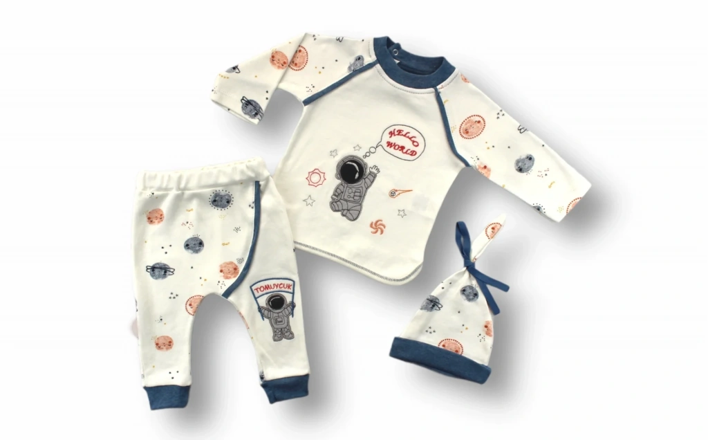 • 3-6 6-9 9-12 Ay Şirin Kozmonot Nakışlı Şapkalı Uzun Kollu Sweatli 3lü Kız-erkek Bebek Takımı