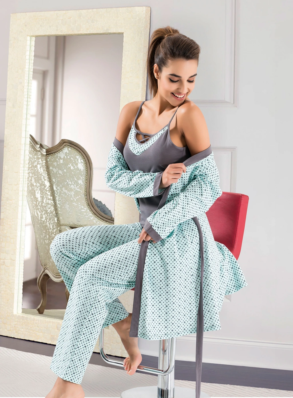 Dantelli Sabahlık Balensiz Desteksiz Dolgusuz Yaka Detaylı Sütyen Ve Pantolon Pijama 3'lü Takım