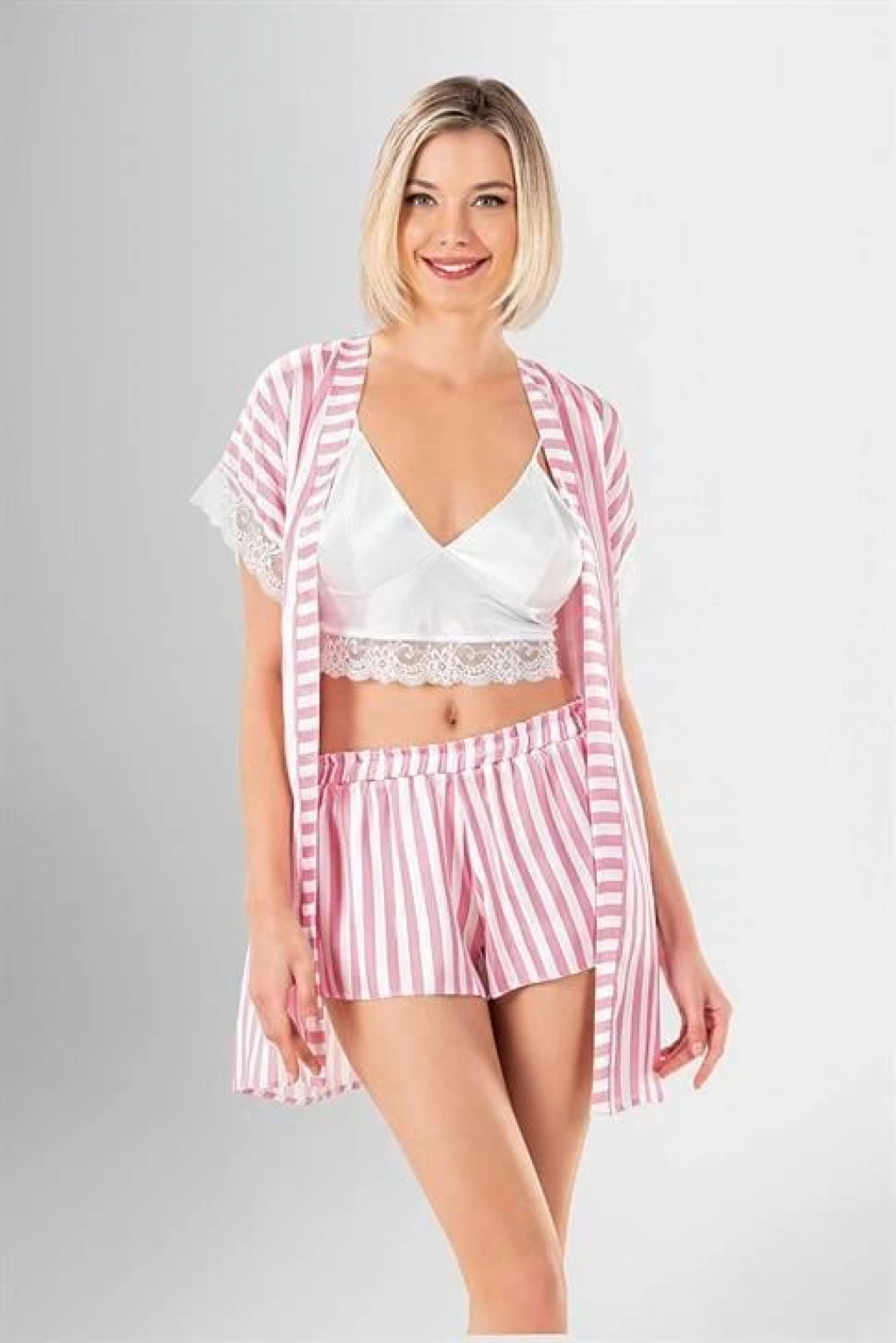 Kadın Saten Çizgili Düğmeli Uzun Kol Dantelli Gömlek Ve Pantolon Pijama Takım