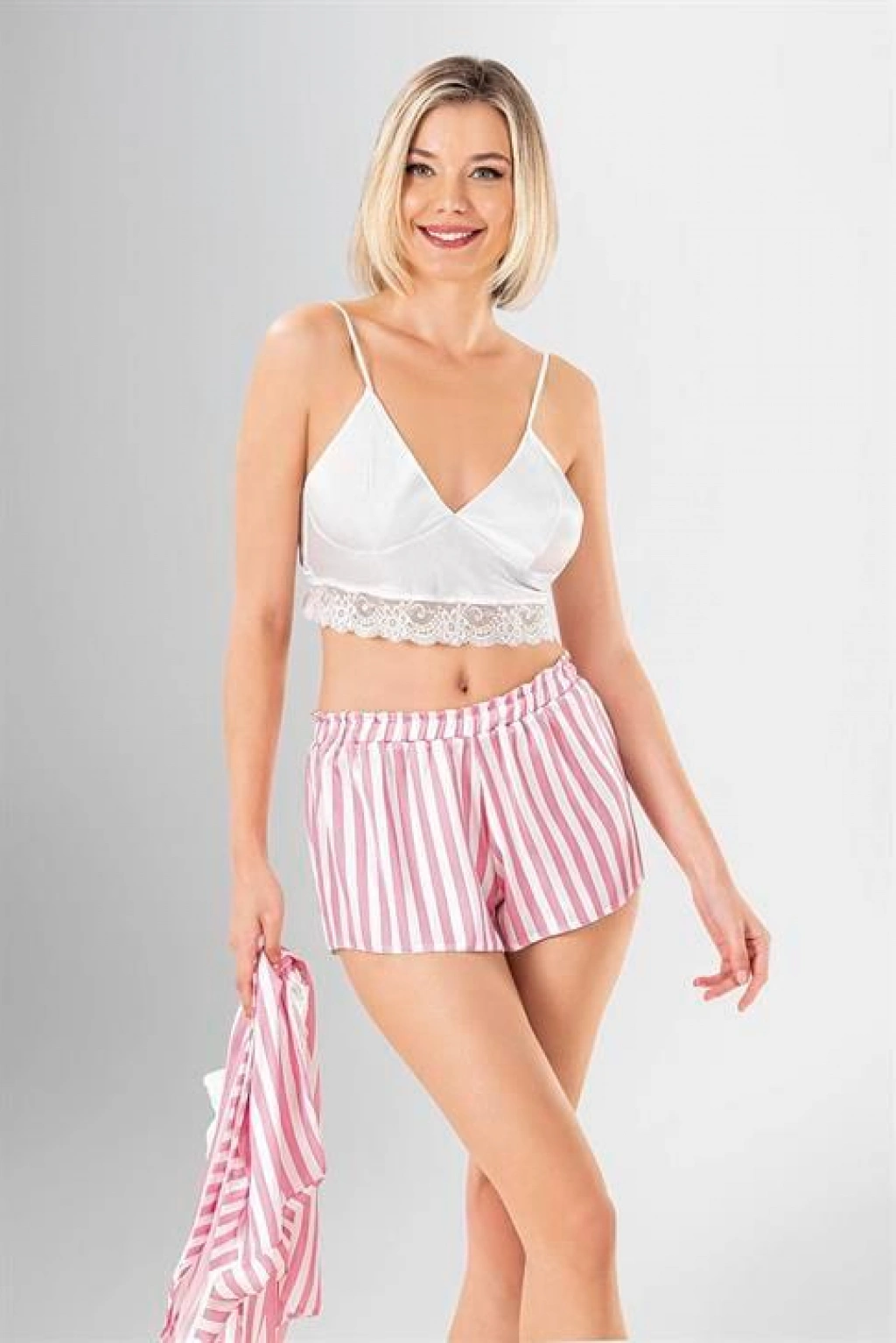 Kısa Yarım Kollu V Yaka Kadın Viskon Düz Yazlık Mini Dantel Detaylı Pijama Takımı