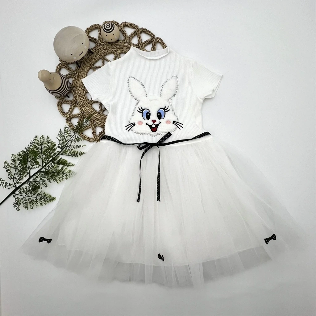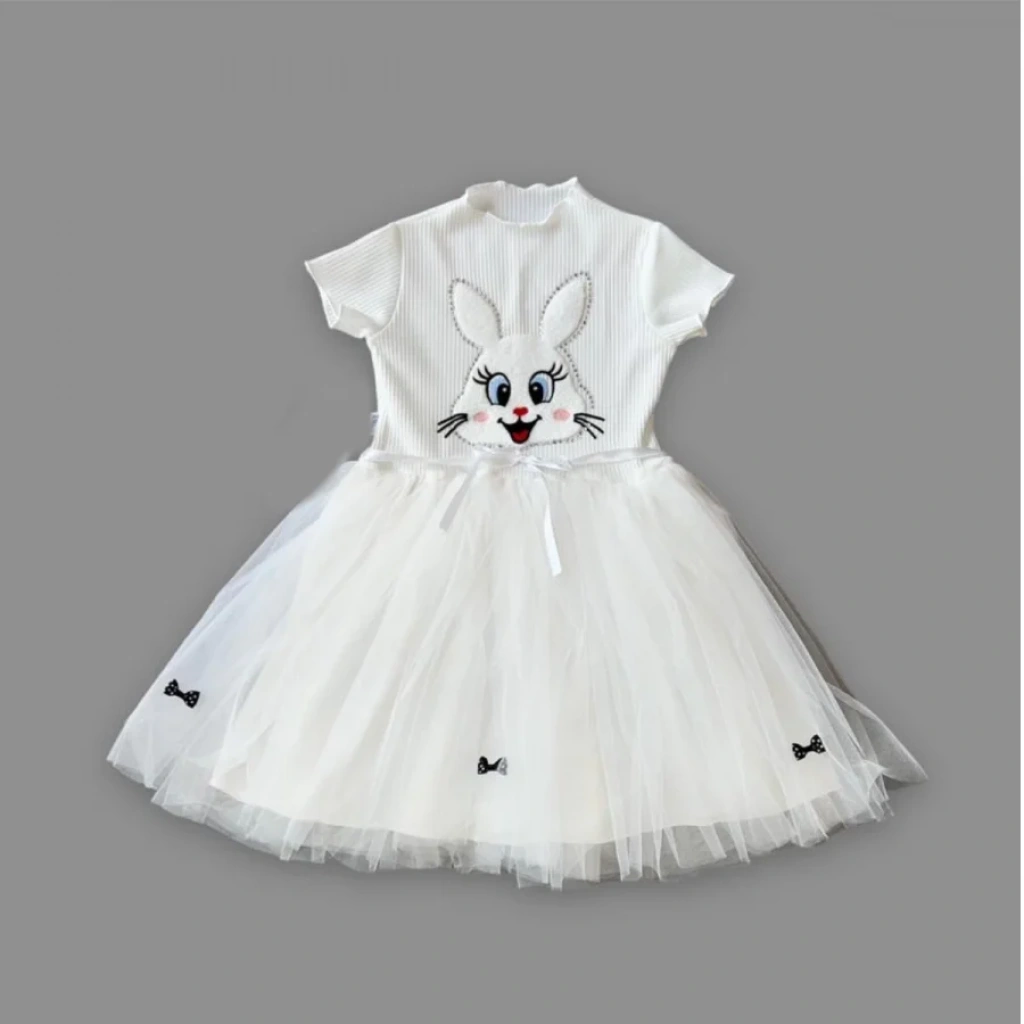 5-6-7 Yaş Payetli Tavşan Baskılı Kız Çocuk Elbisesi Beyaz