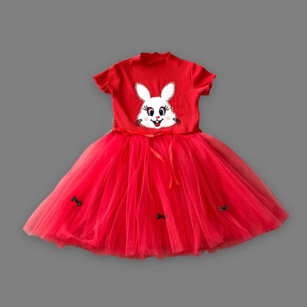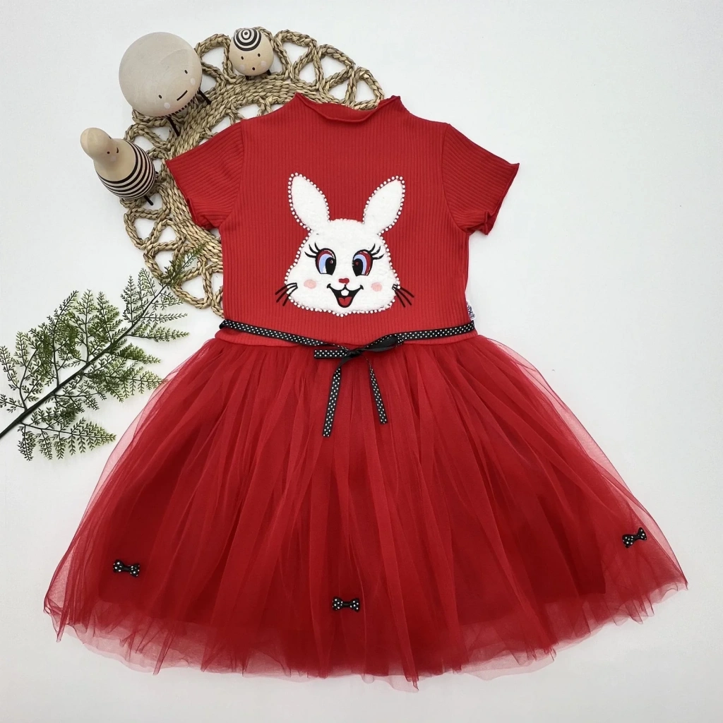 5-6-7 Yaş Payetli Tavşan Baskılı Kız Çocuk Elbisesi Kırmızı