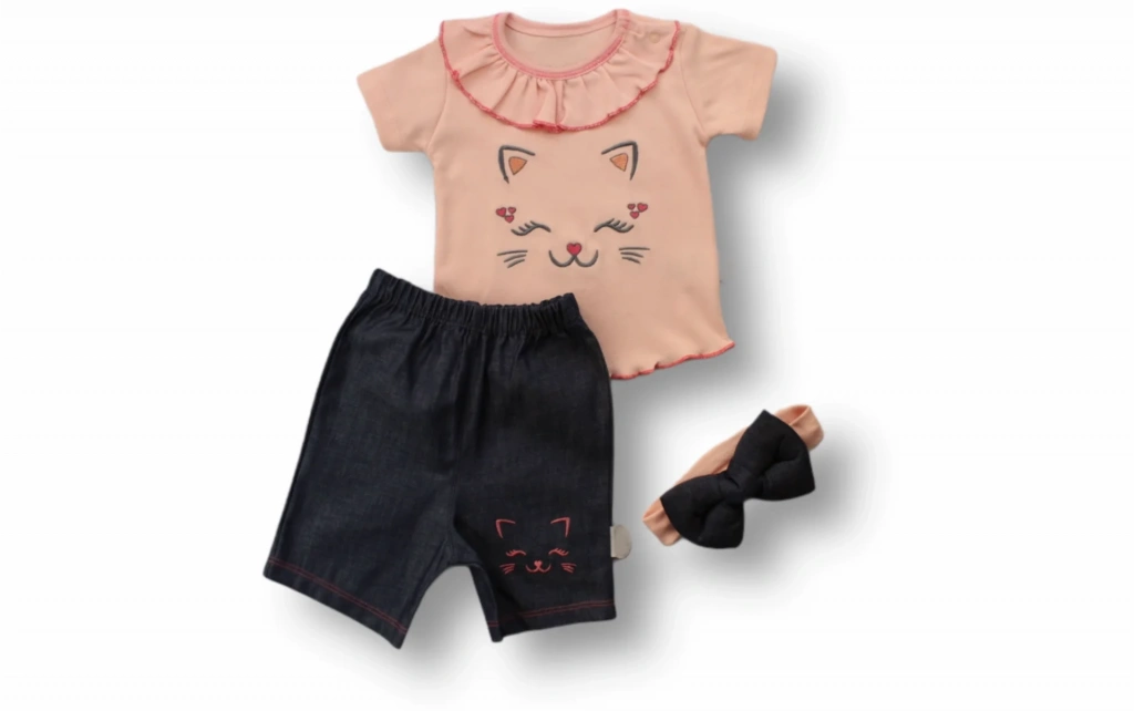 • 6-9 9-12 12-18 Ay Vip Kedi Baskılı Bandanalı Kısa Kollu Sweat 3lü Kız Bebek Takımı