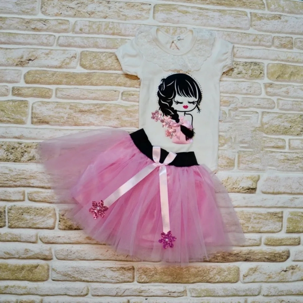 • 9-12-18 Ay Saçı Örgülü Kız Nakışlı Kurdelalı Kısa Kollu Tütü Etek 2li Kız Bebek Takımı