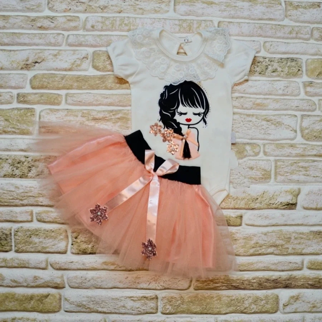 9-12-18 Ay Saçı Örgülü Kız Nakışlı Kurdelalı Kısa Kollu Tütü Etek 2li Kız Bebek Takımı Pudra