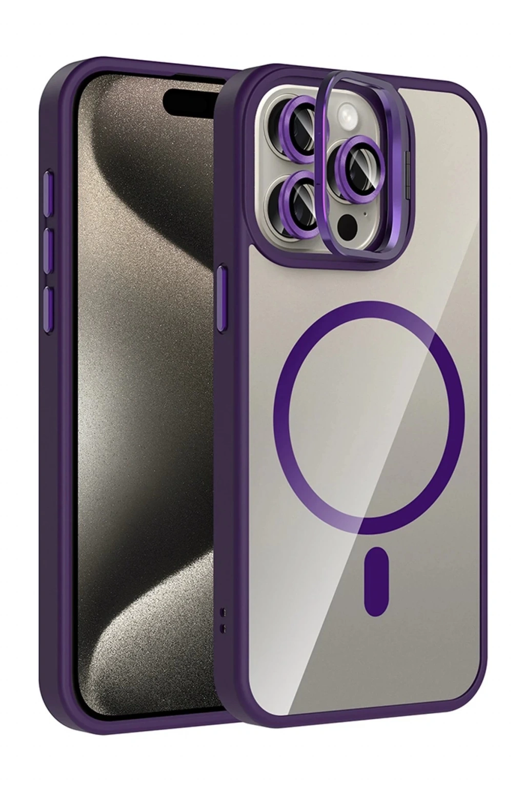Apple iPhone 14 Pro Max Remim Lensli Magsafe Standlı Kapak - Derin Mor