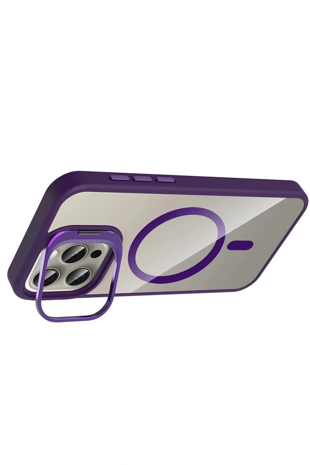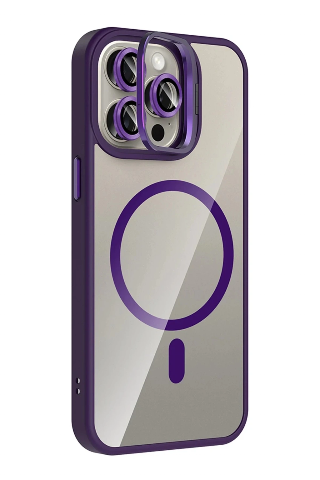 Apple iPhone 15 Pro Max Remim Lensli Magsafe Standlı Kapak - Derin Mor