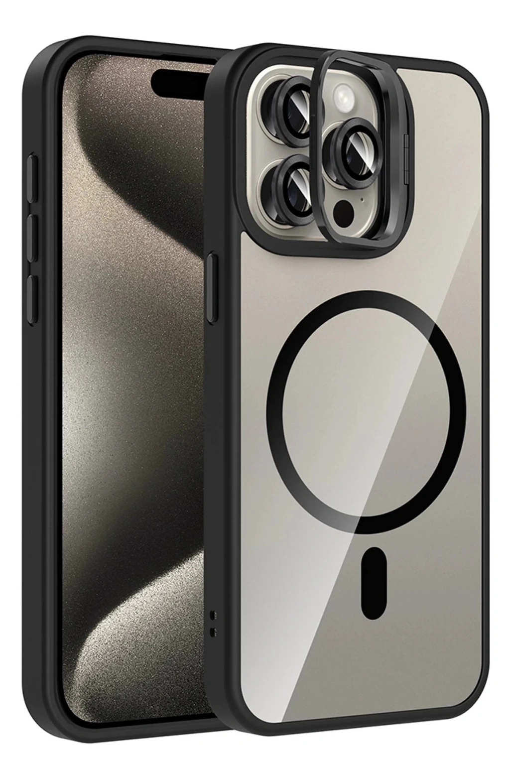 Apple iPhone 15 Pro Max Remim Lensli Magsafe Standlı Kapak - Siyah