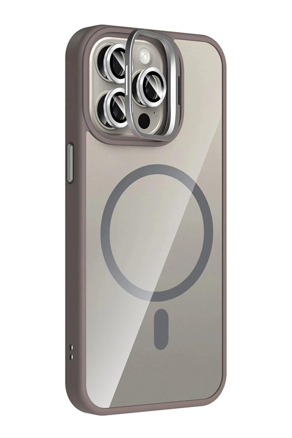 Apple iPhone 15 Pro Max Remim Lensli Magsafe Standlı Kapak - Titan Gri