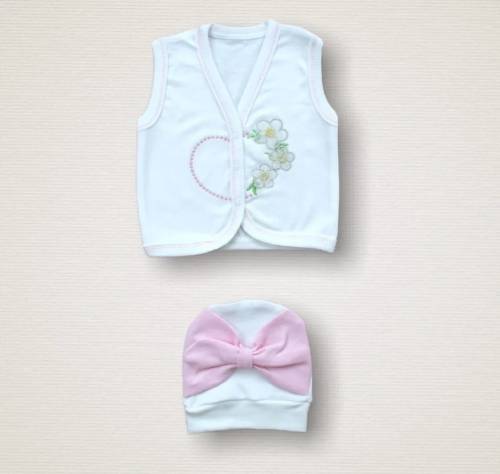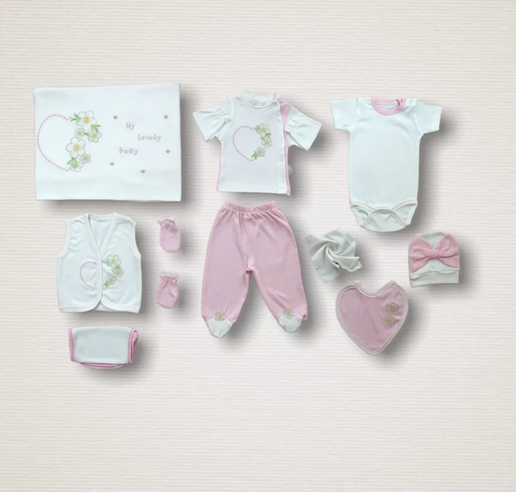 • Baharın Çiçekli Kalbi Nakışlı %100 Cotton Antibakteriyel 10lu Zıbın Takımı Hastane Çıkışı