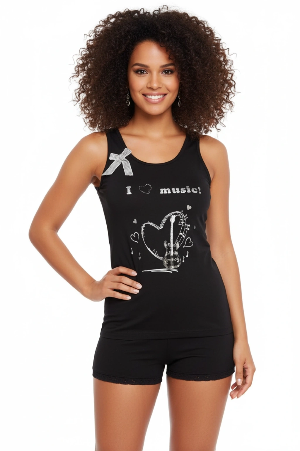Beyaz Dantel İşlemeli Siyah İnce Askılı Saten Şortlu Takım