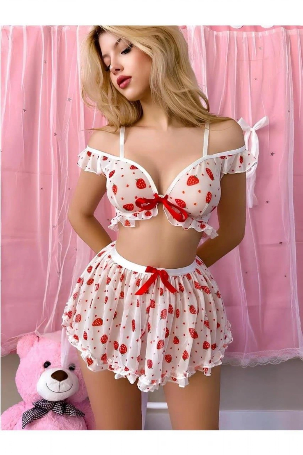 Beyaz Üstüne Çilek Desenli Etekli Fantezi Sütyen Takımı