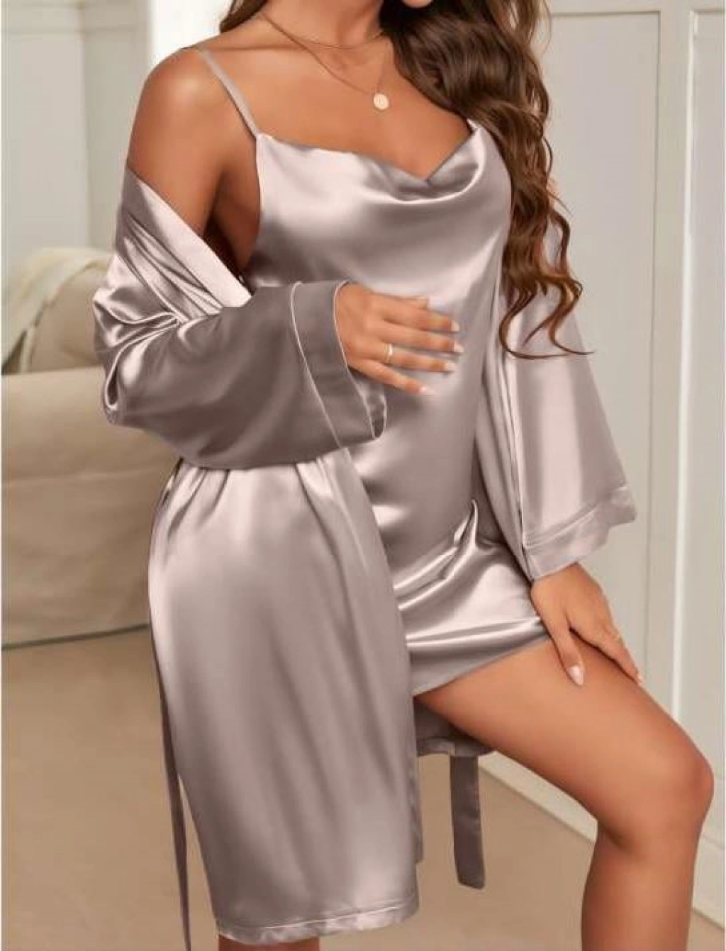 Degajeli İnce Askılı Vizon Saten 2'li Gecelik Sabahlık Takımı