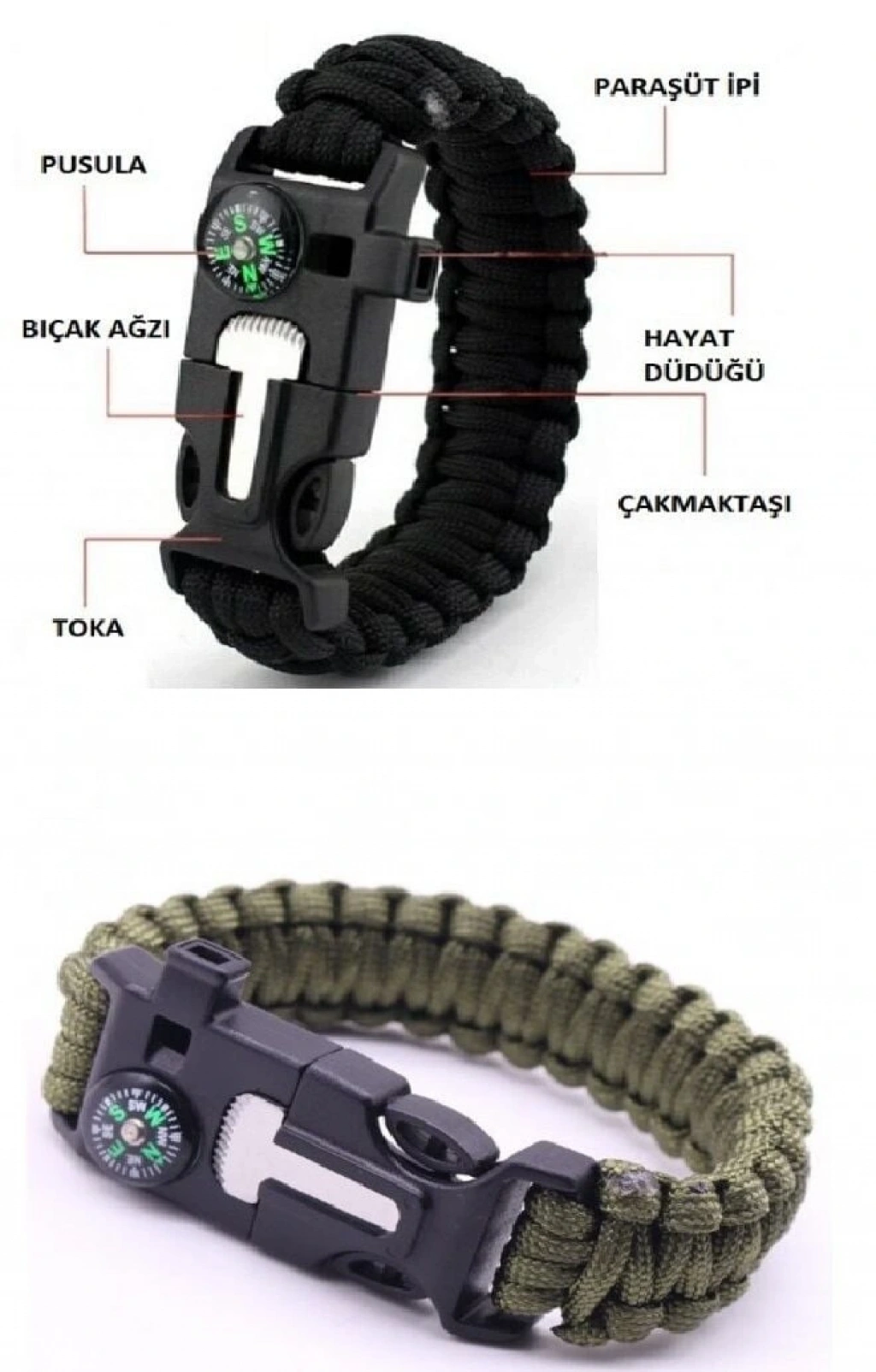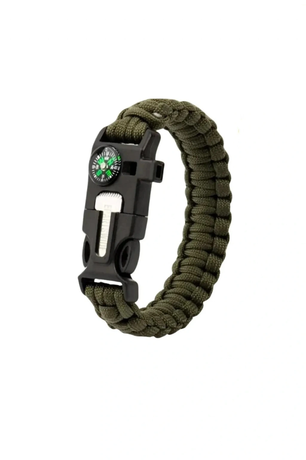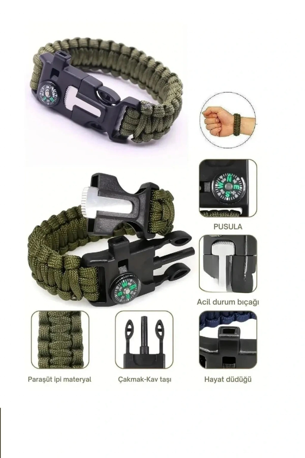 Bileklik hayat kurtarıcı, acil bir durumda kullanılabilen düdük, çakı, çakmaktaşı, pusula ve paraşüt ipi olarak kullanıma uygundur.