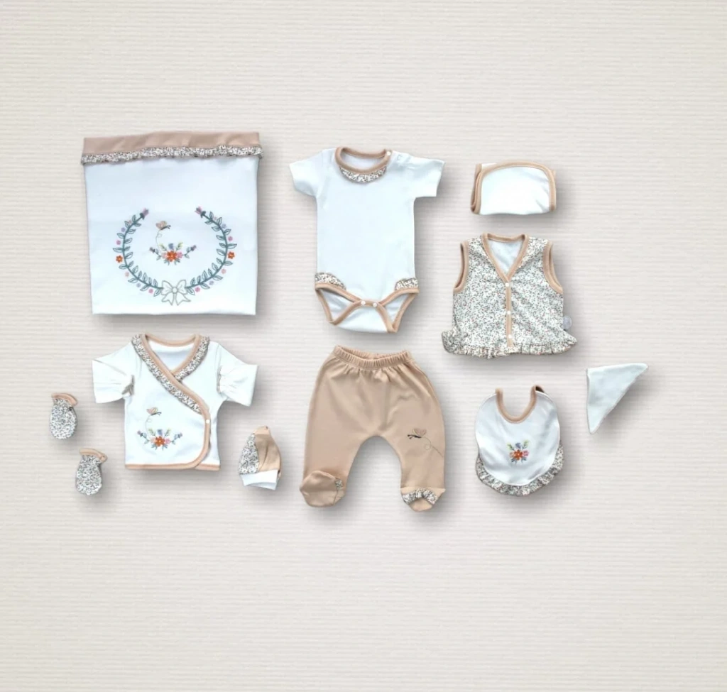 • Erguvan Taç Nakışlı %100 Cotton Antibakteriyel Kız Bebek 10lu Zıbın Takımı Hastane Çıkışı