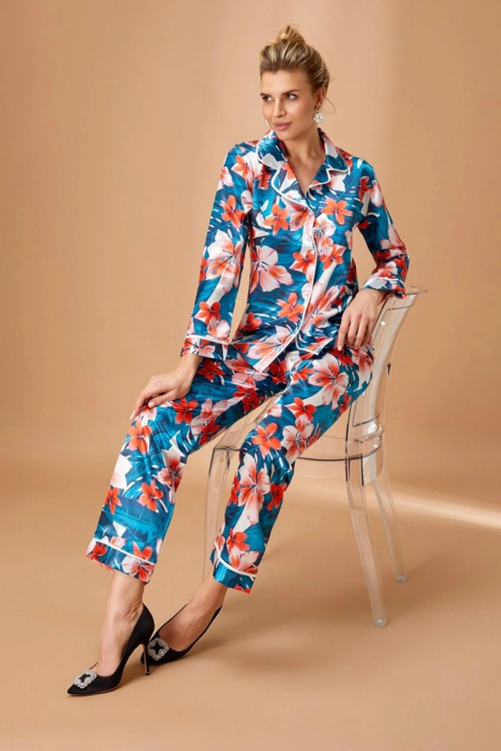 Kadın Lacivert Gül Desenli Askılı Dantel Üst Saten Pijama Takımı 2236