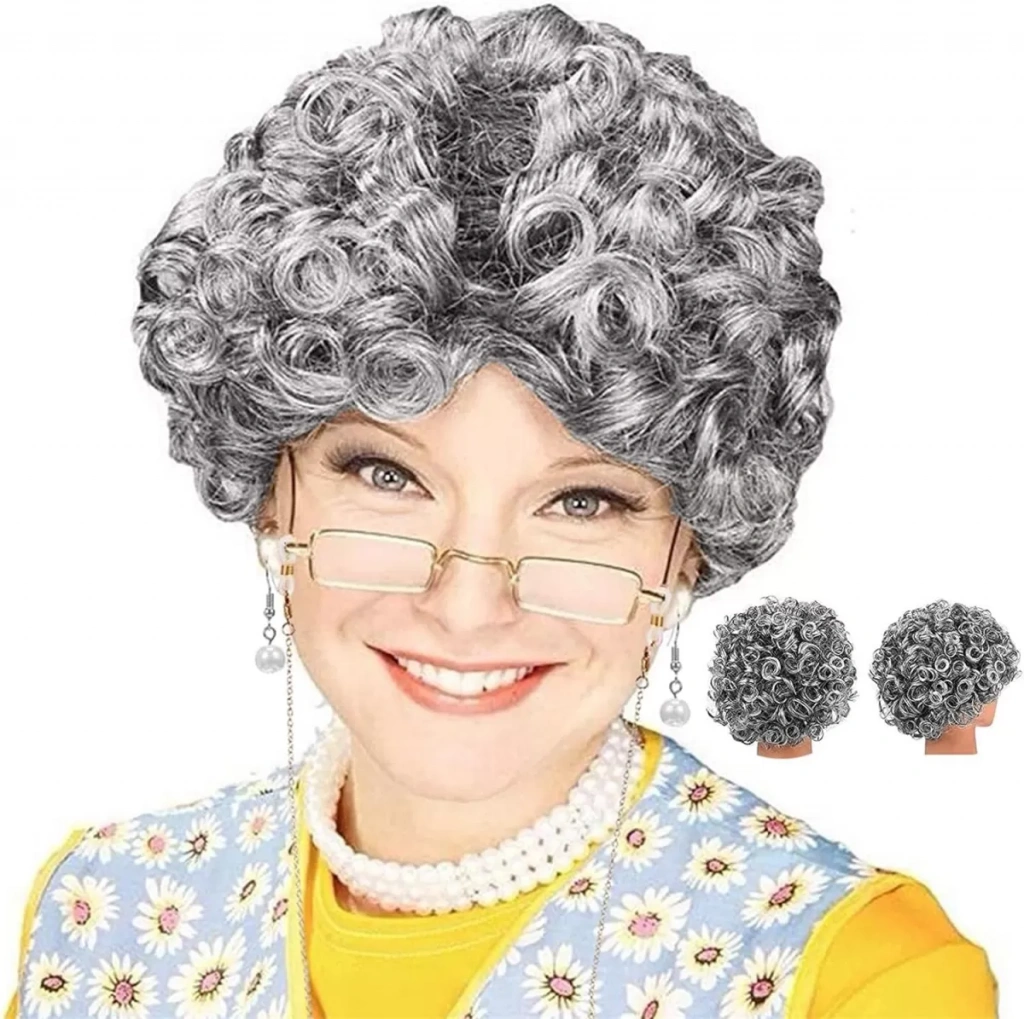 Gri Renk Kıvırcık Yaşlı Peruk Büyükanne Peruğu Astarlı Bonus