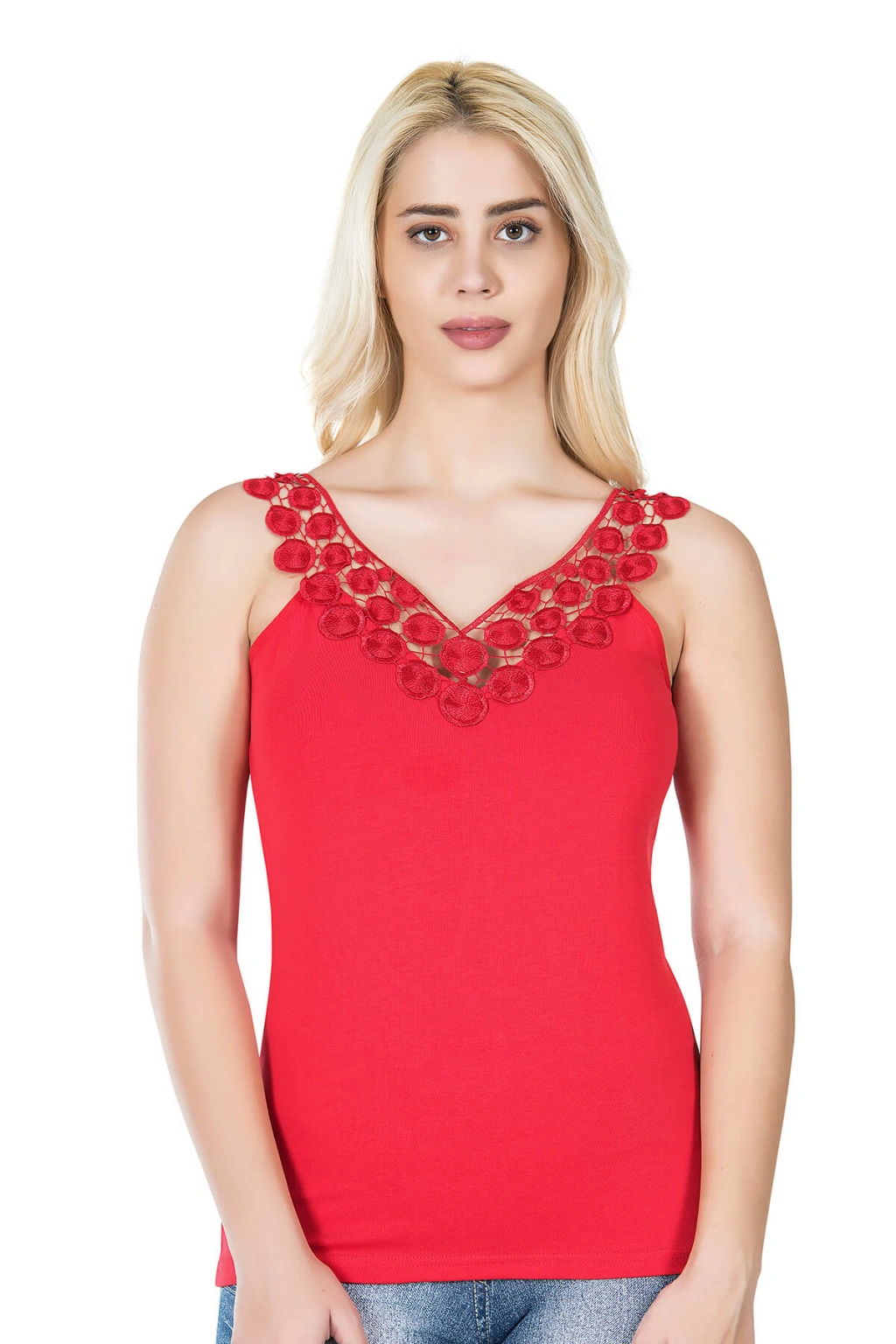 Güpür kabartma dantel detaylı tasarımıyla şık bir görünüm kazandıran sıfır kol kadın tişört modelidir.