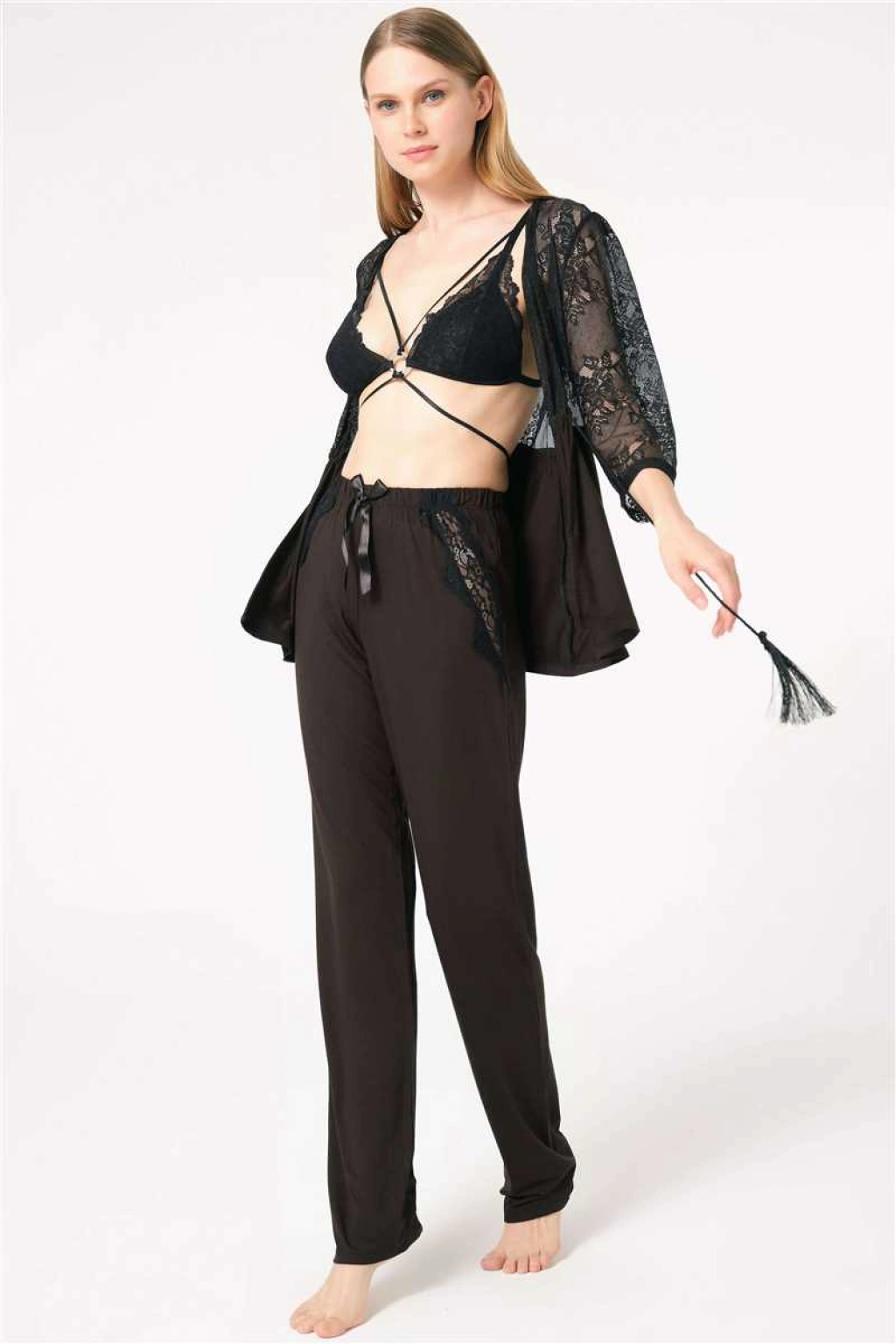 Kısa Ad:Kadın Dantelli Sabahlık Balensiz Desteksiz Dolgusuz Yaka Detaylı Sütyen ve Pantolon Pijama 3'lü Takım (5698)