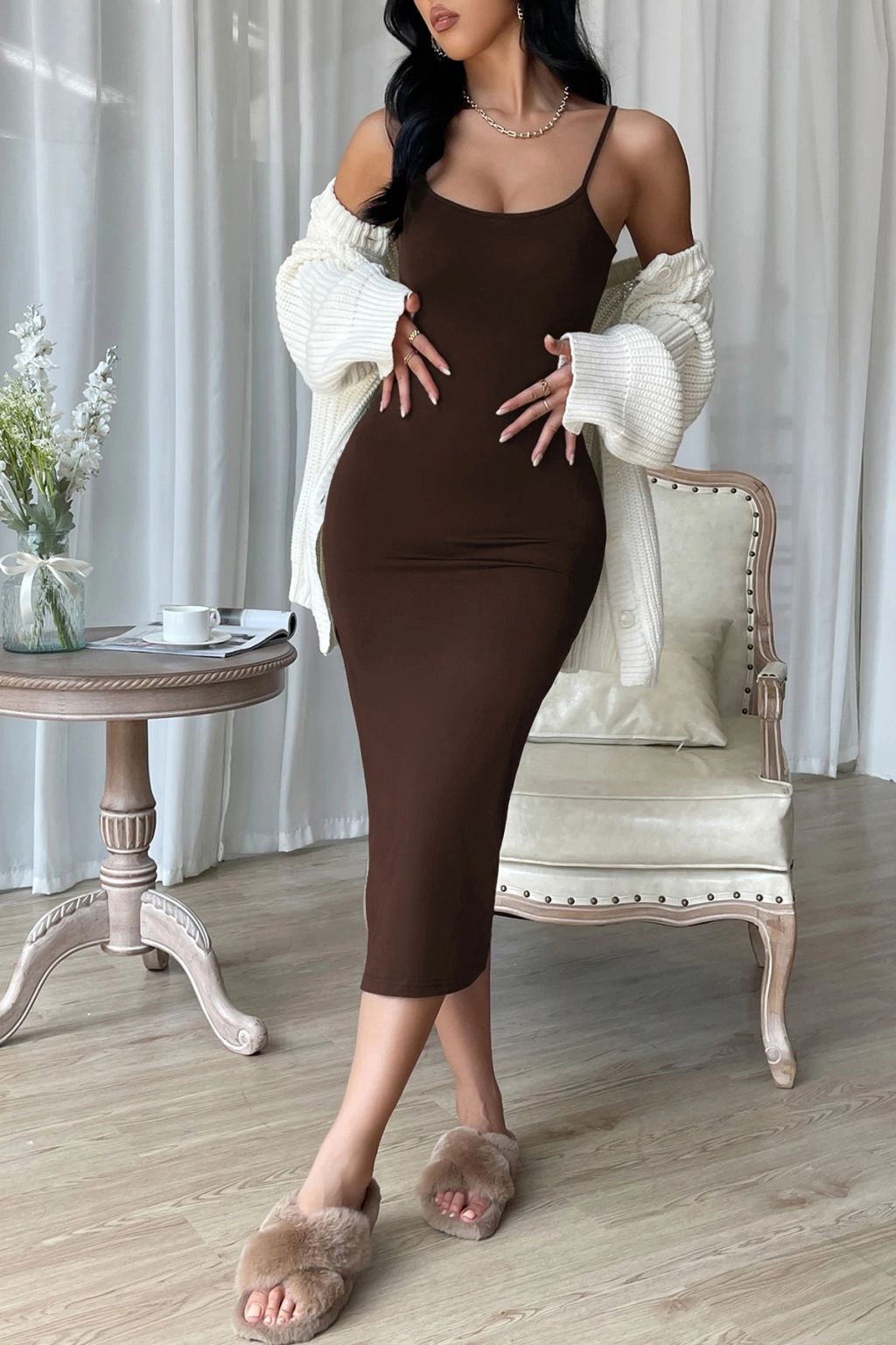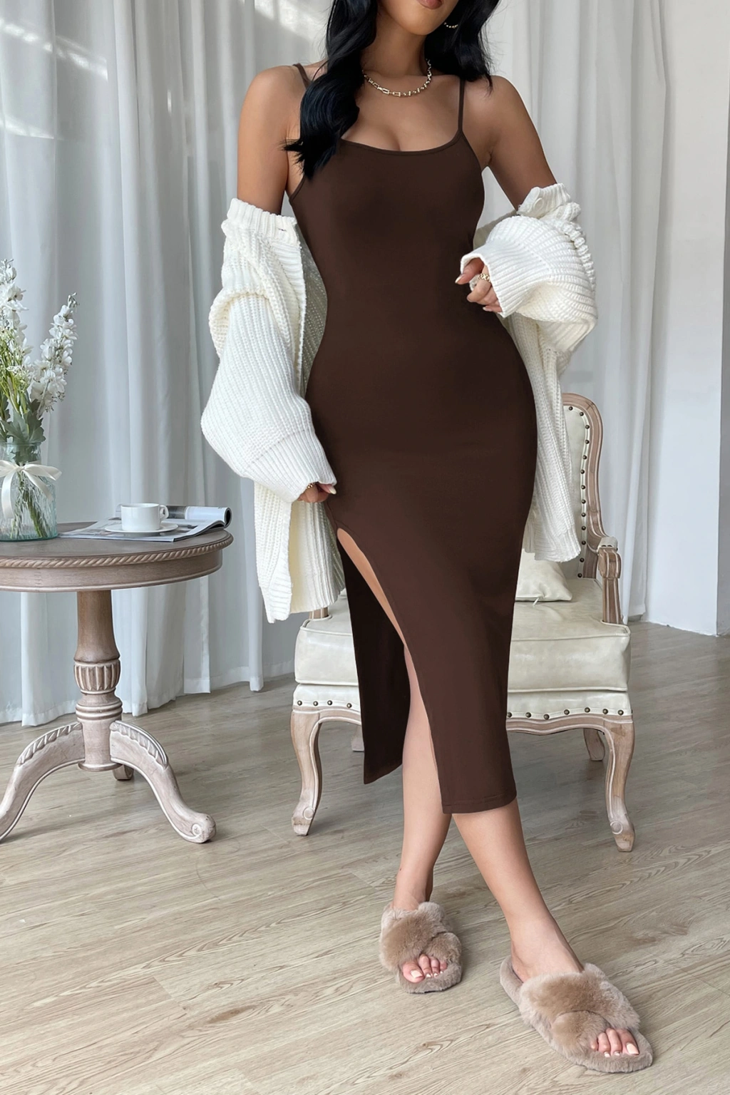 • Kadın Kahverengi Yırtmaçlı Diz Altı Vücüdu Saran Gecelik