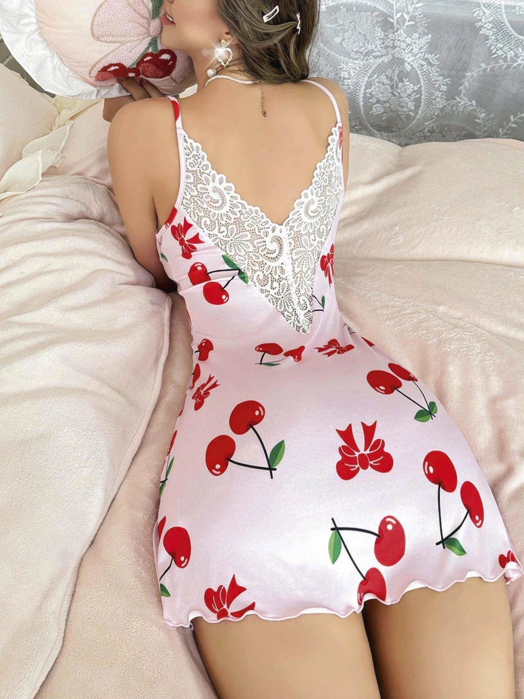 Kadın Kiraz Desenli Dantel Detaylı Askılı Elbise 5067